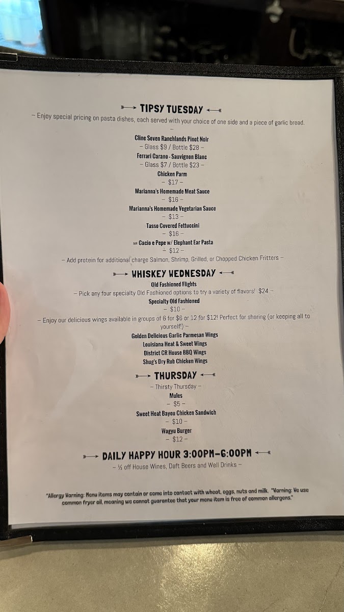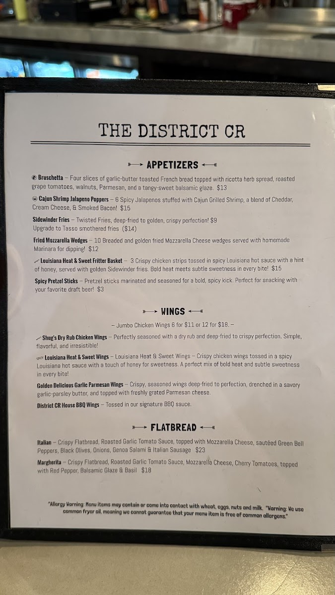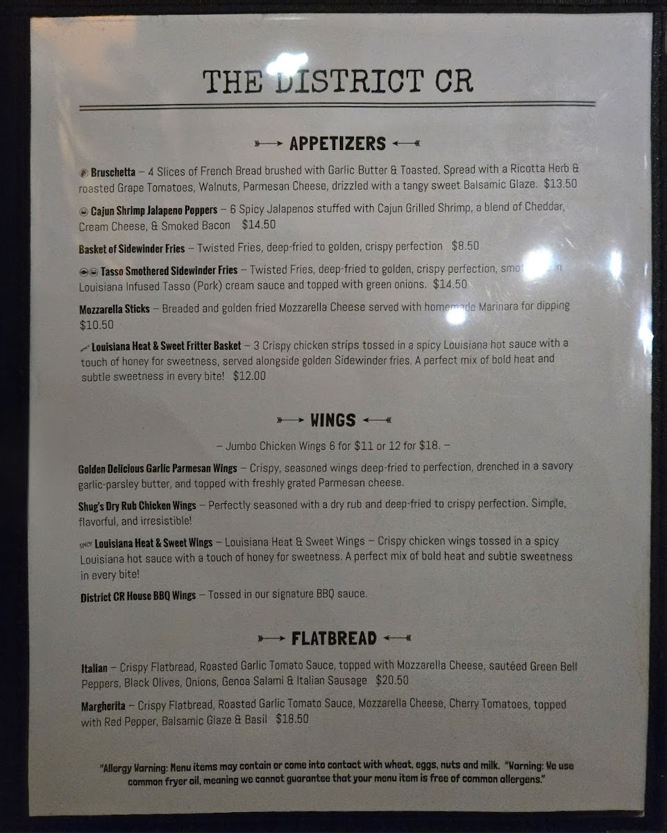The District Cr Menu feels like the kind of lineup you check once and immediately start plotting what you’ll order first. Located at 415 3rd St SE in Cedar Rapids, this spot blends comfort-food favorites with a few unexpected twists, making it easy to wander from one tempting option to the next. You’ll notice how each section somehow leads you toward another-whether you’re eyeing hearty entrées or drifting toward lighter bites when you think you’re being “good.”